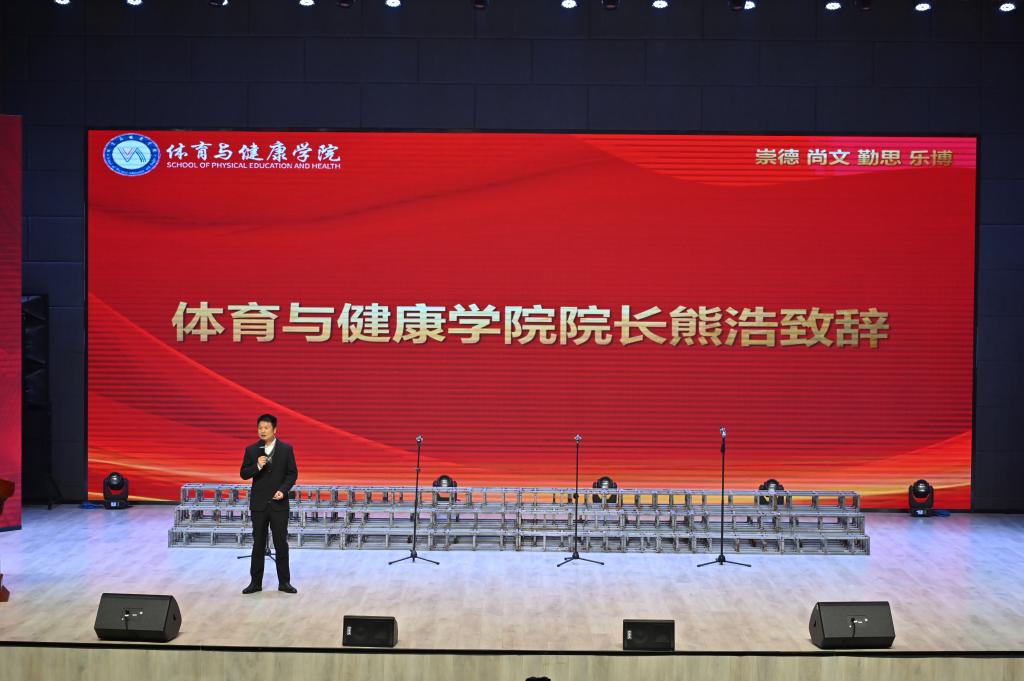 随着温馨动人的学院年度总结视频缓缓播放,本次活动正式拉开序幕。体育与健康学院院长熊浩登台致辞。他系统回顾了过去一学年中,学院在学风培育、学业帮扶、实践创新、学科竞赛等多个领域所采取的具体举措与取得的扎实成效,不仅充分肯定了全体师生在推进学风建设过程中付出的努力与获得的突出成绩,也为下一阶段的学风建设工作明确了方向与路径。他勉励全院学子继续保持昂扬向上的精神风貌,以更加饱满的热情与更坚定的决心,积极投身于学习与实践之中,共同书写学院发展的新篇章。