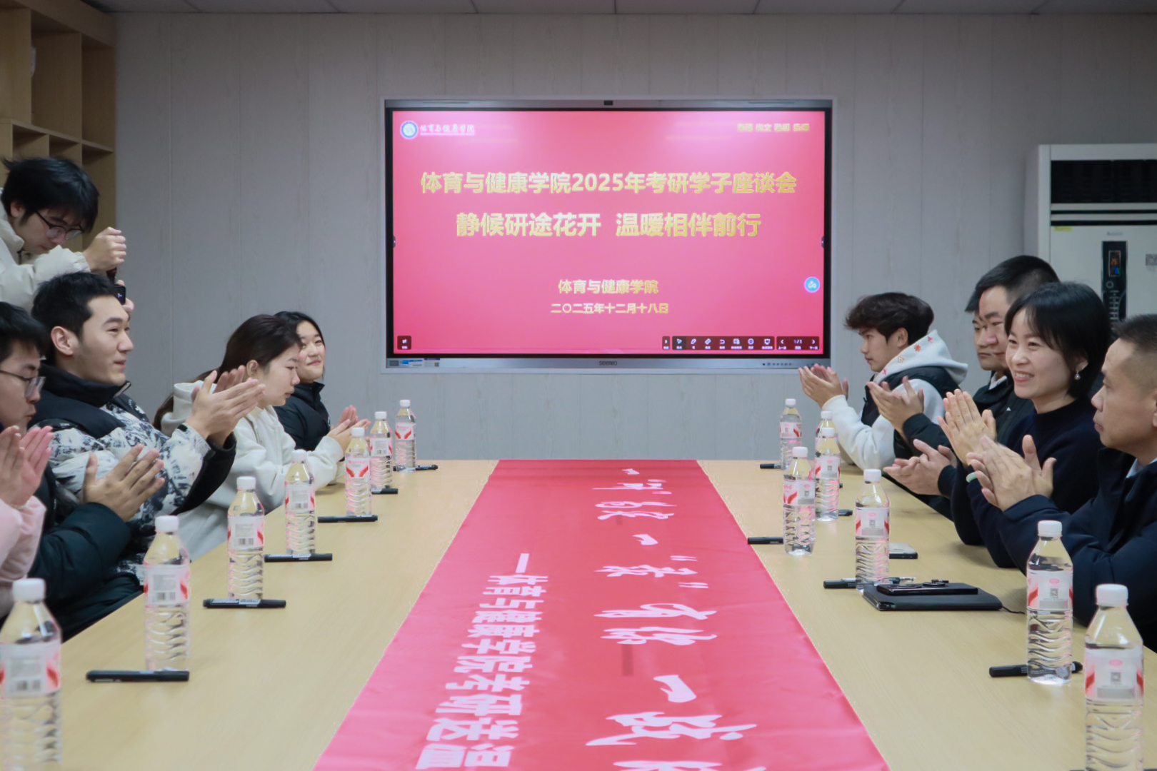 随着2026年全国硕士研究生招生考试的临近,为帮助考研学子缓解压力、坚定信心,12月18日,体育与健康学院在武汉、咸宁两校区同步举办“静候研途花开 温暖相伴前行”考研学子送温暖活动。学院全体党政班子成员、毕业班辅导员与备战考研的学子齐聚一堂,传递温暖、加油鼓劲,以实际行动践行以生为本的育人理念。