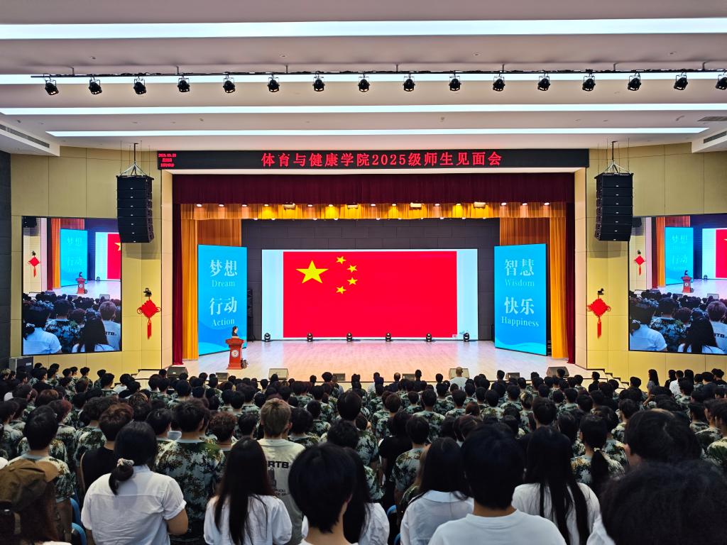 见面会在庄严肃穆的奏唱国歌仪式后正式拉开帷幕。学院党总支书记刘冰清首先代表学院发表欢迎致辞,对新生的到来致以诚挚祝贺,并勉励新生以“崇德 尚文 勤思 乐博”的院训为指引,在大学阶段明确自身定位、树立远大理想,成长为兼具高尚品德与专业本领的体育健康领域专业人才。随后,新生代表、2025级体育教育本科1班宋德鹏同学发言。这位曾服役于中国武装警察部队的退役军人分享了“从军营到校园”的使命传承,号召全体新生“退役不退志、退伍不褪色”,将军人作风融入课堂与训练场。“大学最具魅力之处在于蕴含无限可能。”老生代表、24级健康大数据管理与服务专科3班褚蕊宁以“主动”与“探索”两个关键词,讲述了自己从“金话筒”舞台到志愿服务赛场的收获历程,并承诺全体学长学姐将成为新生最为暖心的“校园向导”。