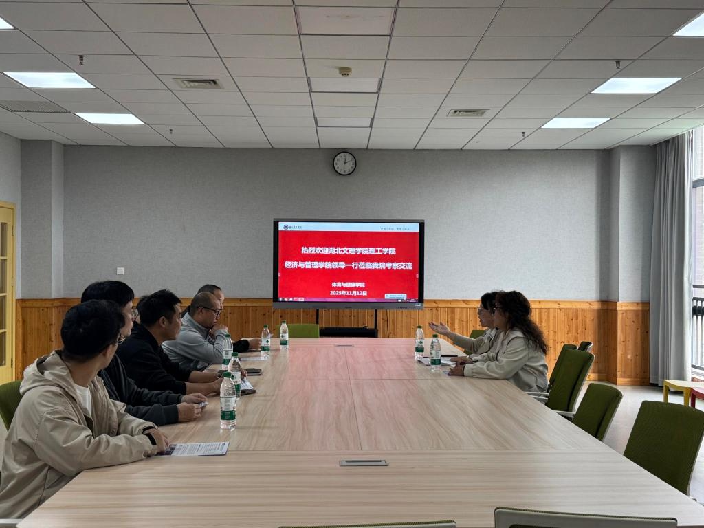 11月12日,湖北文理学院理工学院经济与管理学院副院长朱靖一行赴我院开展调研交流,体育与健康学院院长熊浩,副院长罗磊、余明炜,经济与管理学院副院长徐刚和健康体育教研室相关教师陪同调研,并参加座谈。