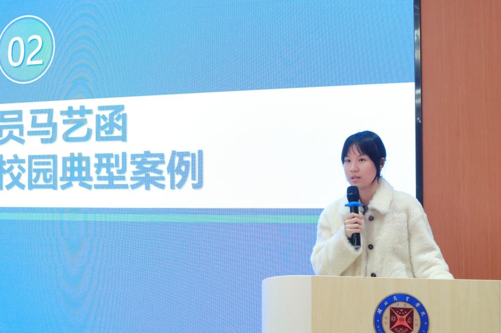 辅导员代表马艺函立足于辅导员工作的现实关切,通过聚焦剖析近期频发的典型案例,给全场学生指出,班级干部绝非普通学生,而是学风建设的前哨,必须率先树牢“纪律红线不容触碰”的底线思维。她要求各班级学生干部将严明的纪律意识内化为履职尽责的根本前提,这既是对学生骨干的严格要求,更是对其健康成长的关键护航,班干部要在广大同学中真正发挥引领风尚的模范带头作用。