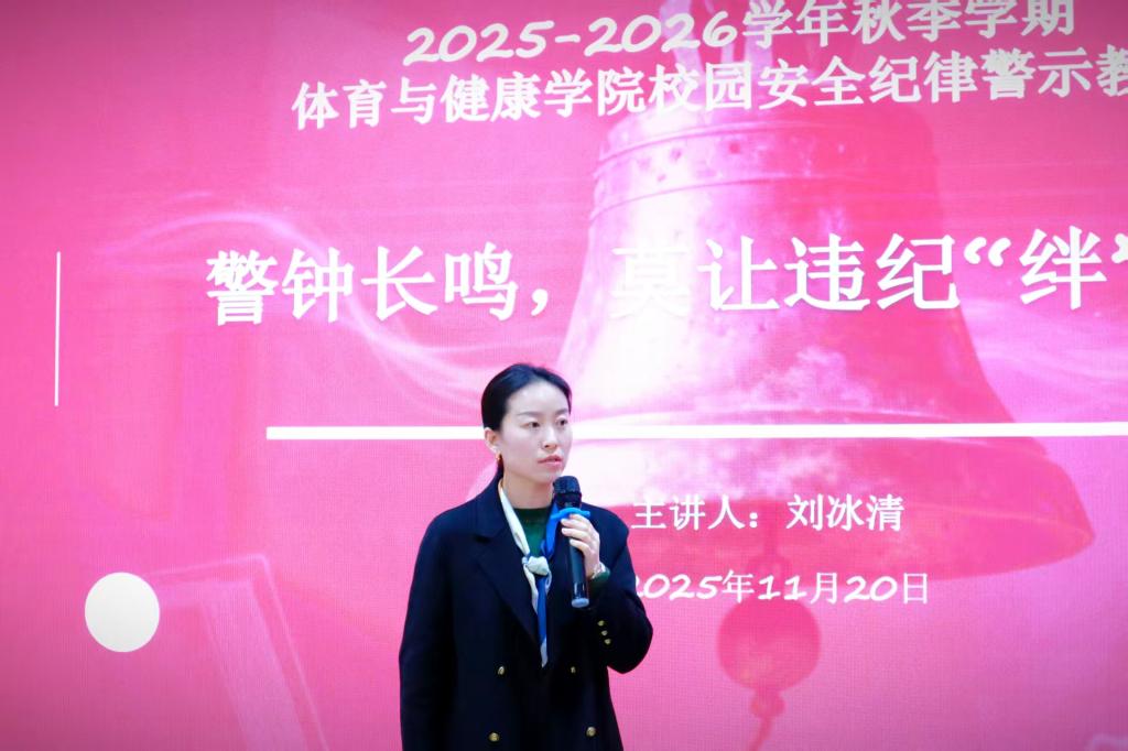 为切实强化学生安全防范意识,压实校园安全管理责任,11月20日,体育与健康学院组织各年级集中召开2025-2026学年校园安全纪律教育警示大会,学院党总支书记刘冰清、党总支副书记吴琼枝、副院长王井强、副院长余明炜出席会议,全体辅导员、各年级学生干部、宿舍长、学生党员、团员、入党积极分子参加会议。