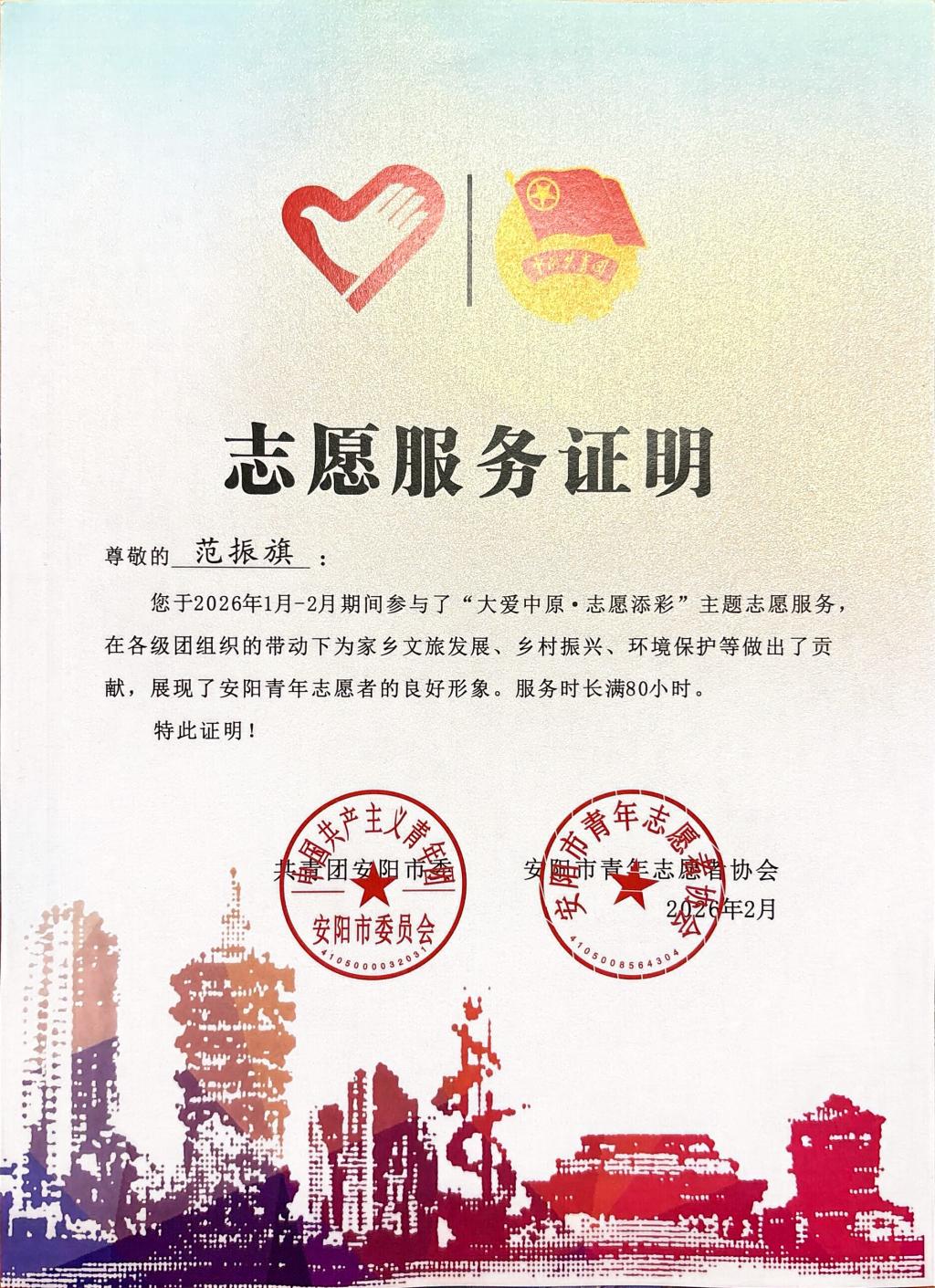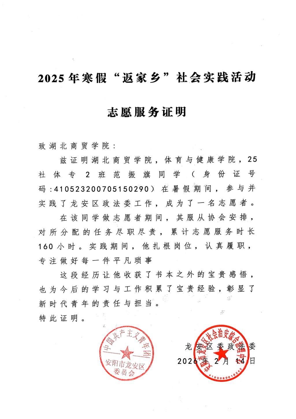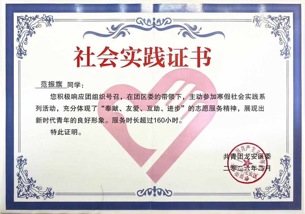 青春赴基层,实践砺初心,实干显担当。2026年寒假,体育与健康学院25级社会体育专业大一新生范振旗,积极响应社会实践号召,踊跃投身2026年寒假“返家乡”大学生社会实践活动,扎根安阳市龙安区政法委社会治安综合治理中心开展志愿服务,在基层一线磨砺自我、服务群众,充分展现了湖商学子的青春风采与责任担当。
