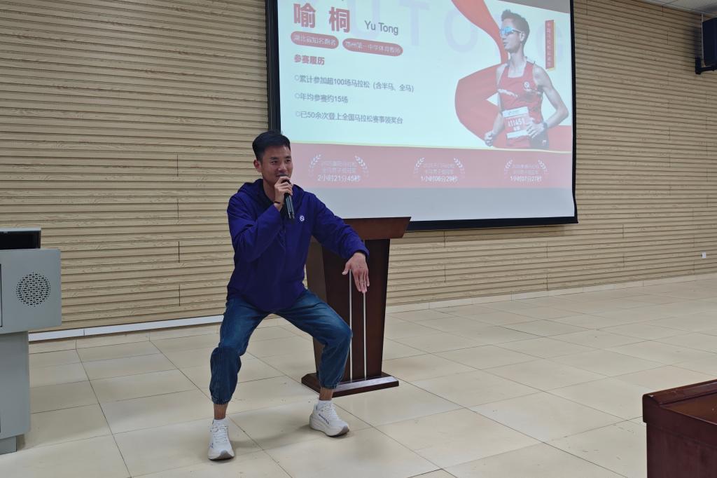 聚焦马拉松运动专业领域,喻桐立足不同群体的运动需求,兼顾专业性与实用性,为在场师生带来了一场干货满满的专题分享。针对跑步入门者,他以“人生的第一次跑马”为主题,系统讲解了从“跑不动”到顺利完成5公里跑步的科学进阶路径,重点拆解配速把控技巧,现场示范跑前热身、跑后拉伸的标准动作,帮助入门者扫清运动障碍、树立科学运动理念。针对进阶跑者,他围绕“马拉松赛道实战与PB突破策略”,深入解析专业备赛计划的制定方法,详细讲解利用操场开展间歇跑、耐力跑等专项训练的技巧,分享独家饮食调理与能量补给经验,助力跑者突破能力瓶颈、提升竞技水平。针对高强度运动中的健康防护问题,他以“运动伤痛预防与赛后科学恢复”为核心,深入分析足底筋膜炎、膝关节损伤等常见运动伤病的成因、急救方法与恢复路径,现场演示宿舍可完成的简易力量训练动作,切实解决了广大跑者在日常训练中遇到的实际难题,传递了“科学运动、健康运动、安全运动”的核心理念。