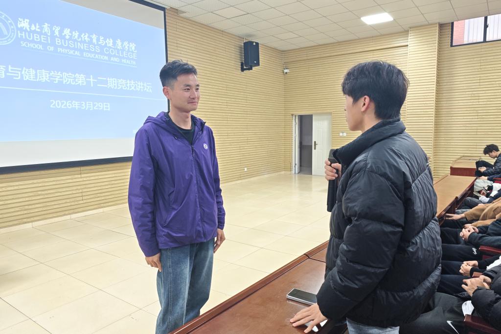 为全面深化体教融合育人实践,3月29日,体育与健康学院在咸宁校区教学楼A-108隆重举办第十二期“竞技讲坛”。本期讲坛特邀中国男子马拉松运动员、鄂州市第一中学体育教师喻桐担任主讲嘉宾,学院24级、25级体育类专业全体学生及全校跑步爱好者共计200余人现场聆听学习。讲坛由辅导员吕盛嘉主持。